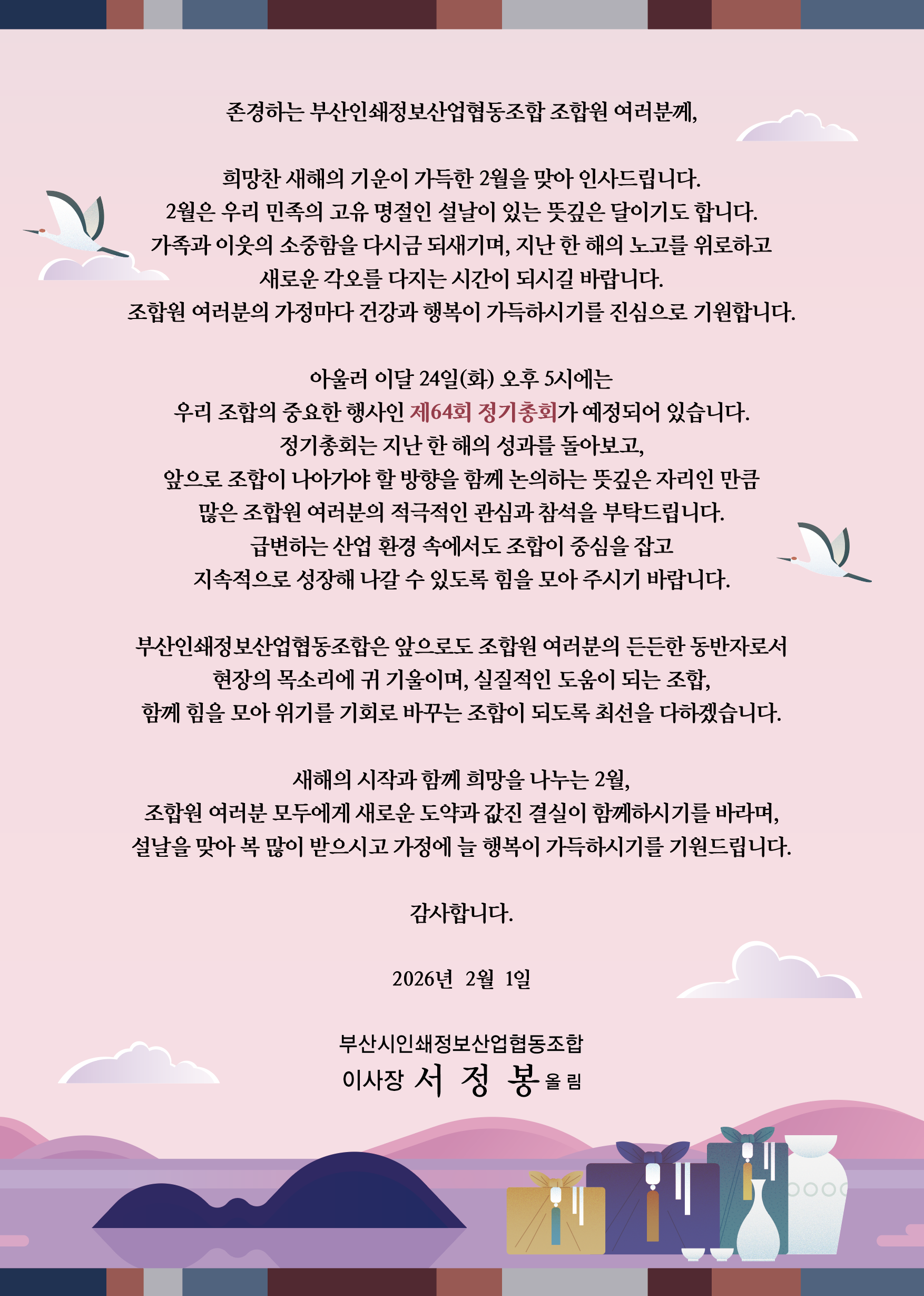 2026년 2월 서정봉이사장 인사말씀 관리자 2026-02-02 11 회 윗글 부산중소기업협동조합협의회-2026년 설맞이 명절음식키트 전달식 참석 아랫글 제3차정기이사회개최(2025년결산이사회) 목록보기 글작성 시 입력하셨던 비밀번호를 입력하세요.