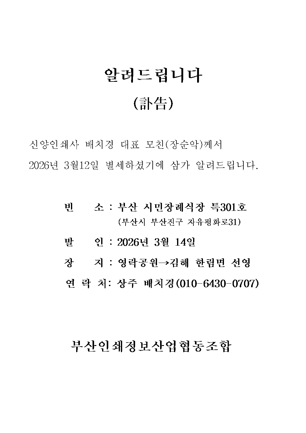 알려드립니다(부고) 관리자 2026-03-12 9 회 윗글 등록된 글이 없습니다. 아랫글 2026년 한국인쇄협동조합연합회 정기총회 참석 목록보기 글작성 시 입력하셨던 비밀번호를 입력하세요.