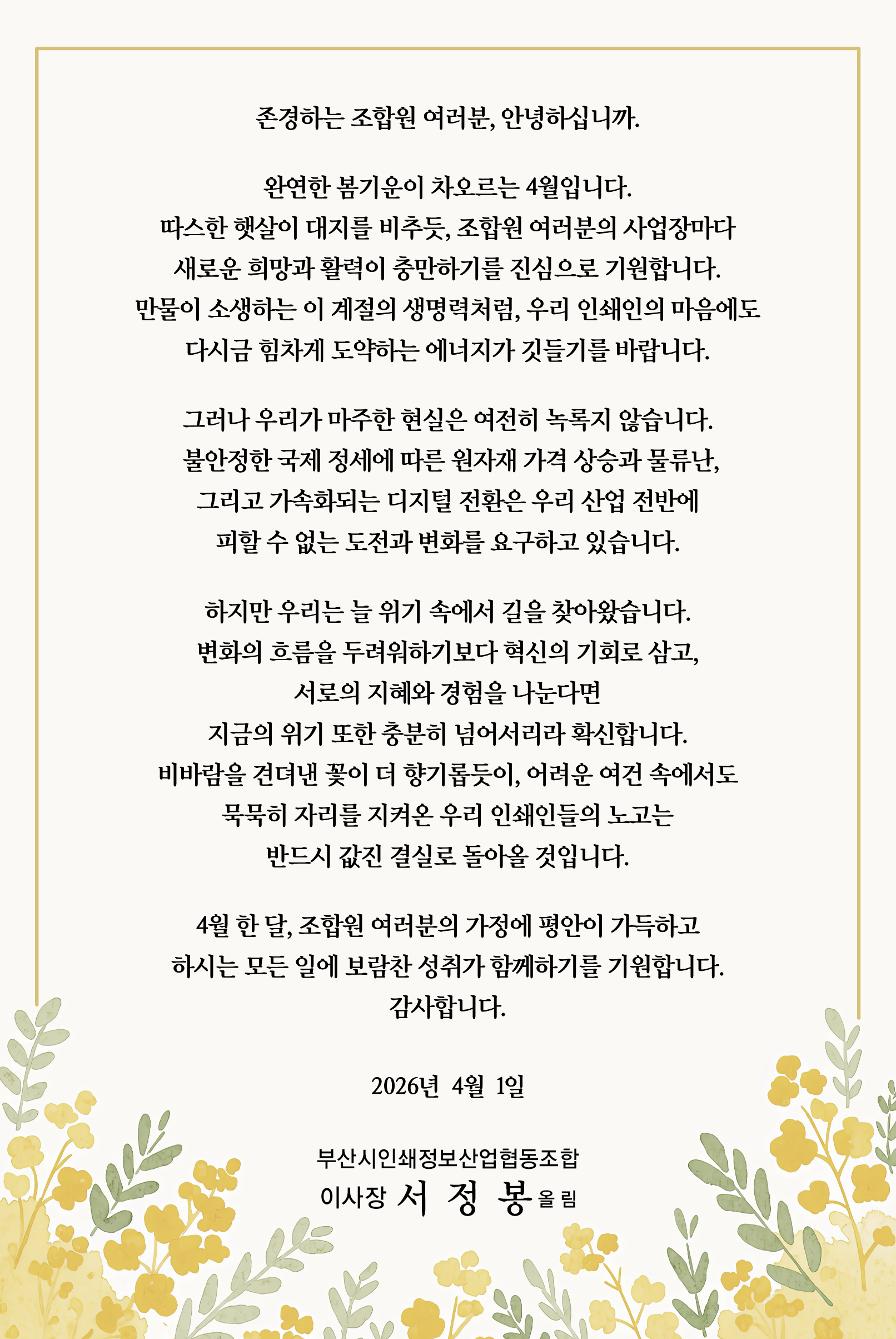 2026년 4월 서정봉이사장 인사말씀 관리자 2026-03-31 9 회 윗글 등록된 글이 없습니다. 아랫글 2026년 지역상품 구매 확대 종합 대책 보고회 -서정봉이사장참석 목록보기 글작성 시 입력하셨던 비밀번호를 입력하세요.